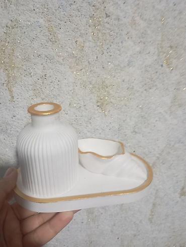 - Material: keramik görünüşlü gips/kompozit (mat ağ səth), kənarları zərif qızılı xəttlə işlənib
