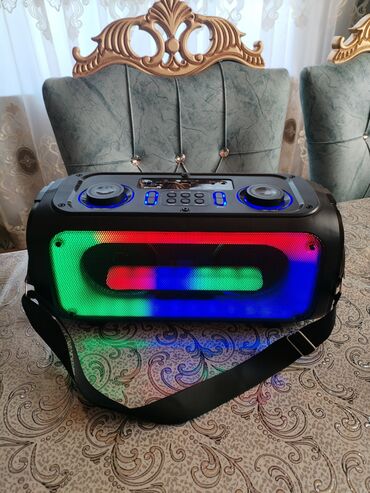 - Güclü portativ akustik sistem, ön paneldə rəngli LED işıqlandırma ilə.