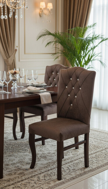 Tünd qəhvəyi rəngdə yumşaq parça ilə üzlənmiş yemək otağı stulu. Arxa hissə kapitone (romb tikişli) dizaynlı və dekorativ daş düymələrlə bəzədilib. Geniş və rahat oturacaq, əyri ağac ayaqlar, sabit...