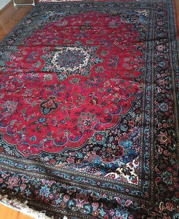Qırmızı tonların üstünlük təşkil etdiyi klassik naxışlı böyük ölçülü xalça. - Üslub: Şərq/iran Təbriz xapçasımərkəzdə iri medalyon kompozisiyası - Rəng palitrası: tünd qırmızı fon, tünd lacivərt ...