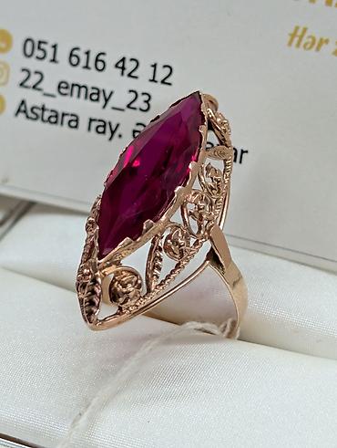 Qızılı rəngdə üzük – marquis (uzun, kəsimli) formada parlaq tünd çəhrayı/yaşıl alt tonlu daşla.