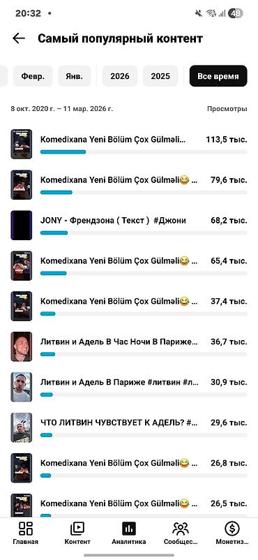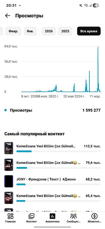 - Kontent növü: qısa komediya videoları (“Komedixana Yeni Bölüm Çox Gülməli”), musiqi/tekst videoları və trend mövzular