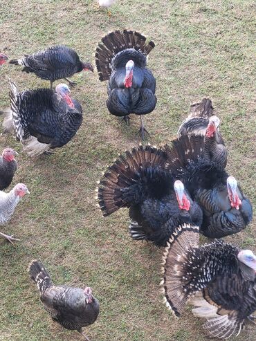 Məhsul: Hinduşka sürüsü Təsvir: - Şəkillərdə gördüyünüz damazlıq yönümlü hinduşkalar iri cüssəli, güclü döş əzələləri və sıx, parıltılı tük örtüyü ilə seçilir. Qara-bürünc (bronza) və ağ rəngli fə...
