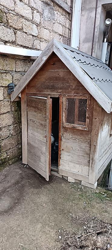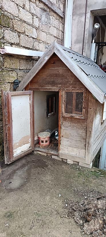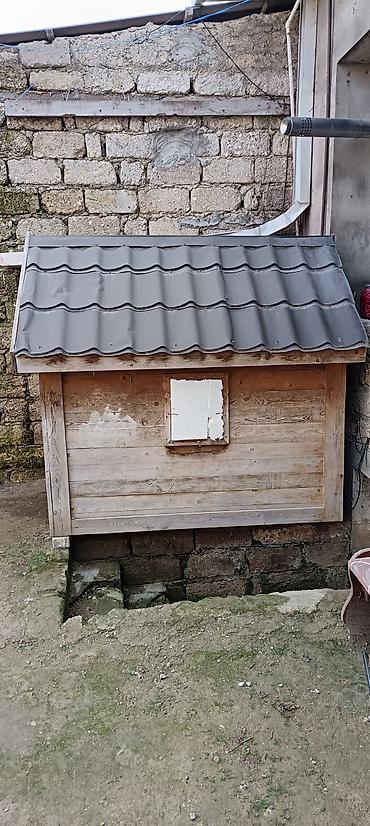 Taxta quşxana/it evi - Material: qalın taxta karkas, taxta üzlük - Ölçü: təxminən 1,6–1,8 m uzunluq, 1,1–1,3 m en, 1,4–1,6 m hündürlük (fotolara əsasən) - Dam: dalğalı metal/profil örtük, ikiqat m...