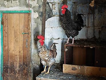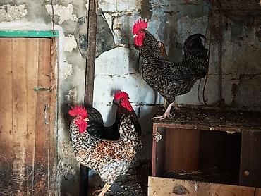 Məhsul: Xoruzlar (8 ədəd) Təsvir: - Şəkildə iki sağlam xoruz görünür: biri qırmızı-qəhvəyi rəngli, digəri qara-ağ naxışlı tüklərə malikdir. - Böyük, açıq qırmızı daraq və sallantıları var. - Güclü...
