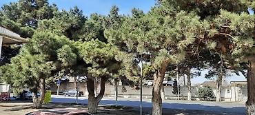 - Önündə geniş açıq sahə/parking və iri şam ağacları ilə kölgəli zolaq