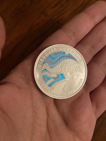 - Arxa tərəf: Emu təsviri, mavi rəngli detal və “DISCOVER AUSTRALIA – 2011 EMU 1oz 999 SILVER” yazısı