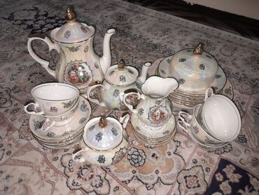 ● Çay Servizi ● Farfor. Təzə. Ukrayna istehsalı. 12 fincan + 12 nəlbəki + 1 ədəd çaydan + 1 ədəd pesok qabı + 1 ədəd süd qabı. Qiyməti : -- 80 azn.