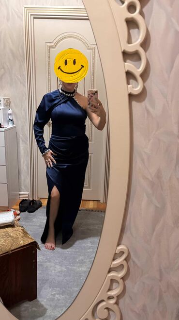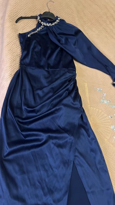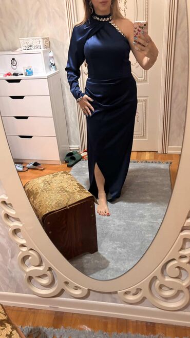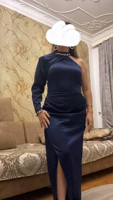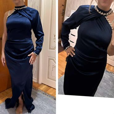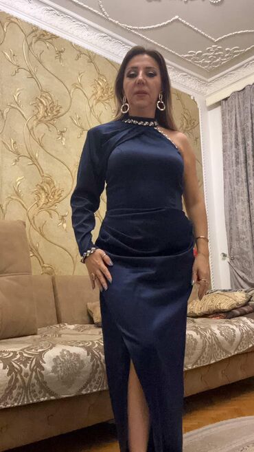 1 ay öncə 300 man alınıb. Bir dəfə toya geyinilib. Ölçü: 44 Məhsul: Qadın gecə/libas Brend: ADM Exclusive Ölçü: TR 44 / EU 44 / RU 50 Rəng: Tünd göy (şimmerli parıltılı) Təsvir: - Uzun, zərif silu...