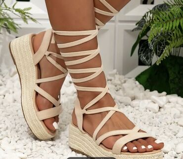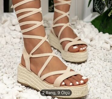 36 razmer..Bej rəngdə, dabanlı və qayışlı qadın səndəlləri. Ayaqqabıların ön hissəsində dekorativ daşlar var. Ziyafət və xüsusi günlər üçün idealdır.