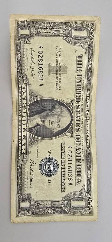 ABŞ 1 dollar gümüş sertifikatı – Series 1957 Pul özü qoruyucu banknotda saxlanılır və alan alıcıya banknot qoruyucusu hədiyyə verilir. Xüsusiyyətlər: - Növ: Silver Certificate (frontda “SILVER CER...