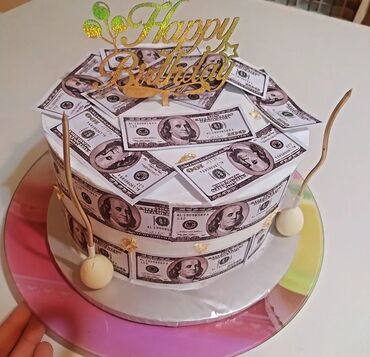 Ağ rəngdə, yumru formalı tort "Happy Birthday" yazısı olan qızılı bəzəklə tamamlanıb. Tortun üzərində və kənarlarında 100 dollarlıq banknot təsvirləri və qızılı rəngli ləkələr var. Bu tort ad günlə...