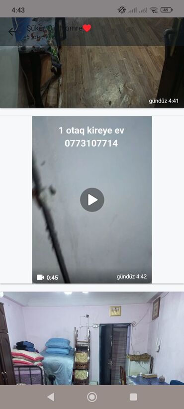 Şəkillərdə göstərilən bütün mebel və məişət əşyaları ilə birlikdə təqdim olunur. Rahat yerləşim, gündəlik yaşayış üçün zəruri ehtiyaclar təmin edilib. Şəkillərdə “1 otaq kireyə ev” yazılı elan mövcuddur. Telefon nömrələri paylaşılmır.