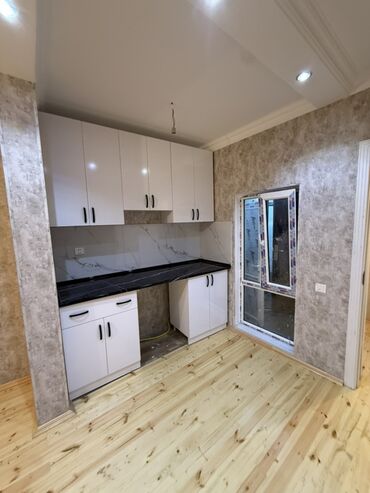 - Açıq planlı qonaq otağı ilə birləşən mətbəx: ağ yüksək parlaq fasadlı asma və alt şkaflar, mərmər naxışlı arxa panel, tünd rəngli iş masasının üstü, elektrik/duzlaşdırıcı çıxışları hazır.