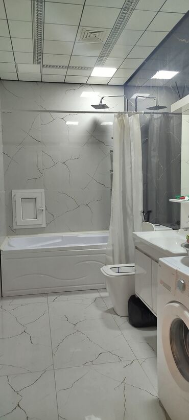 - Sanitar qovşaq: vanna, çəllək duş başlığı (yağış duşu), pərdəli duş zonası, unitaz, əl-üz yuyan, güzgülü rəf, paltaryuyan maşın üçün yer. Divar və döşəmələr mərmər naxışlı kafel ilə.