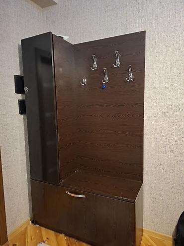 Dəhliz üçün şkaf-komplekt Hündürlük 205 cm. Yan şkafın eni 50 cm - Material: ağac naxışlı laminat (isti qəhvəyi ton) - Komplekt 3 hissədən ibarətdir: 1) Asılqan paneli – üstündə raf və 6 ədəd met...