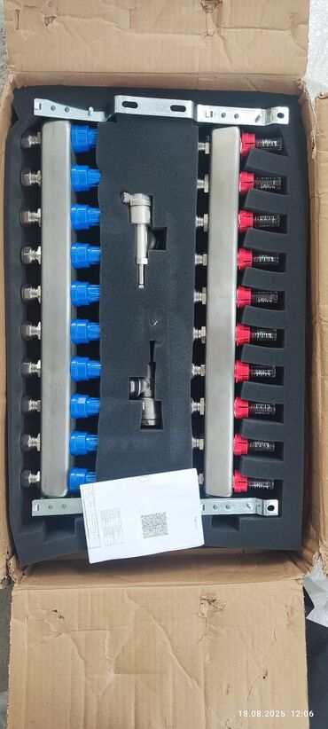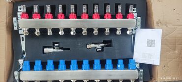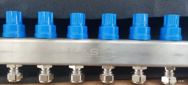 KAS markalı 10 çıxışlı termostatik kollektor təqdim olunur. Bu qurğu isitmə sistemlərində və ya su təchizatında maye axınının effektiv idarə olunması üçün nəzərdə tutulmuşdur. Sistem iki ayrı şinəbənddən ibarətdir; birində qırmızı başlıqlı tənzimləyicilər, digərində isə mavi başlıqlı tənzimləyicilər mövcuddur. Hər bir şinəbənddə 10 çıxış mövcuddur. Sağ tərəfdəki qoşulma hissələri sistemə maye daxil olması və çıxması üçün nəzərdə tutulub. Qurğu divara quraşdırmağa imkan verən möhkəm metal dayaqlar üzərindədir. Bu kollektor, çoxsaylı dövrələrin olduğu isitmə və ya supaylayıcı sistemlərdə istifadə üçün uyğundur.