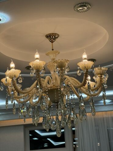 Klassik üslubda kristal çilçıraq - Material: çoxsaylı asılmış kəsimli kristal/prizma daşlar, metal karkas (qızılı-ton dekor). - Dizayn: barokko motivli budaqlı konstruksiya, şam formasında patron ...