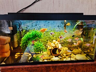 - Böyük ölçülü vitrin tipli akvaryum: geniş ön şüşə, dekorativ ağ çərçivə, üst işıqlandırma, arxa fon dekoru. Aşağıda taxta şkaf/stand (saxlama üçün əlverişli). - Orta ölçülü qövs formalı akvaryum...