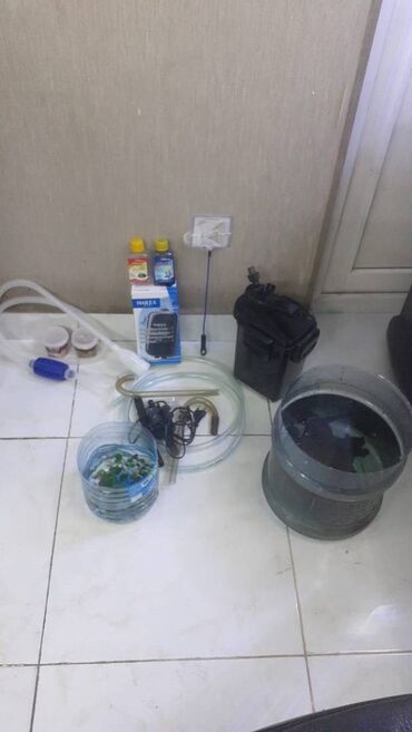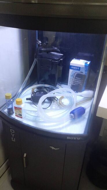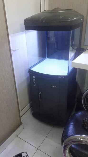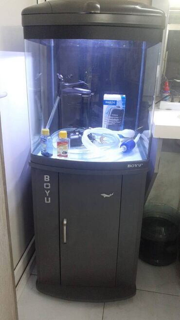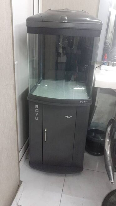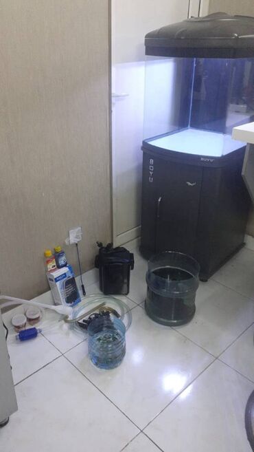- Böyük ölçülü vitrin tipli akvaryum: geniş ön şüşə, dekorativ ağ çərçivə, üst işıqlandırma, arxa fon dekoru. Aşağıda taxta şkaf/stand (saxlama üçün əlverişli). - Orta ölçülü qövs formalı akvaryum...