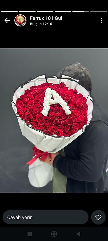 Gül dəstələri – Beyaz Flowers dizaynı - Qırmızı güllərdən ibarət klassik buket: ağ büküm kağızı, gümüşü-yaşıl evkalipt yarpaqları və gipsofila (ağ “uğur otu”) ilə zənginləşdirilmiş kompozisiya. En...