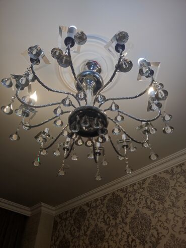 Dekorativ tavandan asılan işıqlandırma lüsturları və asqılar dəsti - Kristallı, çoxqatlı şaxəli iri lüster: qızılı metal karkas, damcı formalı kristal asqılar, güclü işıq yayımı üçün çoxsaylı E14/...