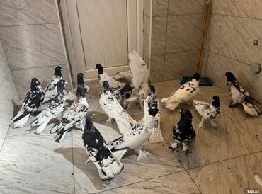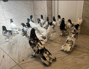 Məhsul: Güvercinlər (dekorativ/oyun uçuşlu cins) Təsvir: - Şəkildə 6 ədəd güvercin görünür: 3-ü tam ağ, 3-ü ağ-qara naxışlı. - Ağ-qara quşlarda baş və boyun hissəsində qara yaxalıq, qanadlarda qar...