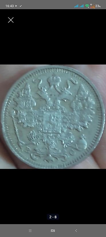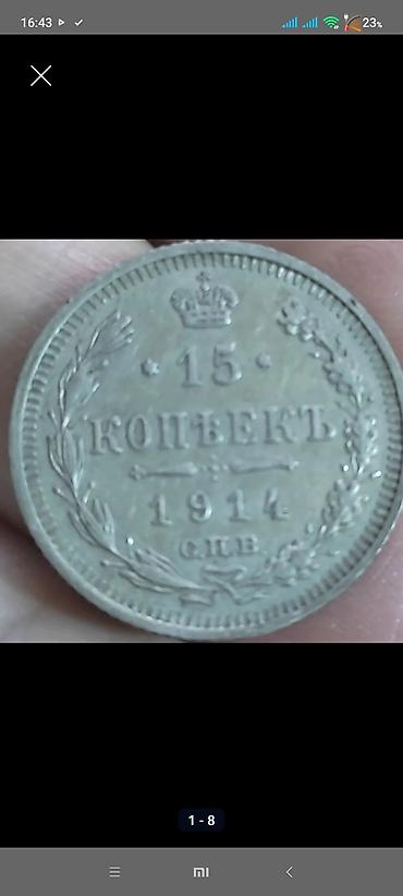 Rus İmperiyası dövrünə aid 15 kopeyka sikkəsi – 1916 Xüsusiyyətlər: - Nominal: 15 kopeyka - Buraxılış ili: 1916 - Üzərində laurel və palıd budaqları, yuxarıda tac təsviri - Ağırlıq: 2.70 q (fotoda...