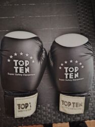Boks üçün dəst: - 1 cüt qara boks əlcəyi – “TOP TEN” bilək bandajlı, “Professional” yazılı, yumruq hissəsi ağ uclu, qalın doldurmalı. Biləyi möhkəm saxlayan geniş velkro bağlanma. - 1 ədəd baş qoru...