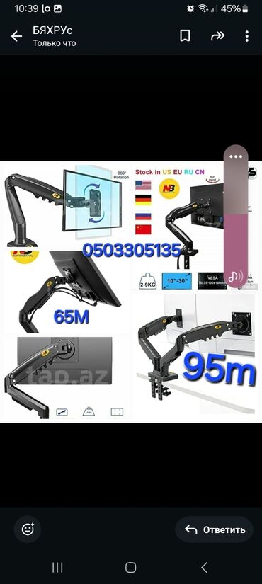 NB F80 tək qollu monitor tutacağı/kronsteyni. Kronsteyn orginal məhsuldur. Monitoru istenilen istiqamətdə hərəkət etdirmək olur. ✅Uygun monitor ölçüləri: 17"-35” ✅Maksimum ağirliq - 9 kg ✅ VESA öl...