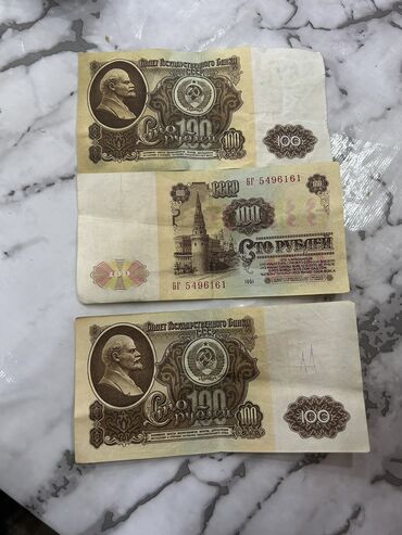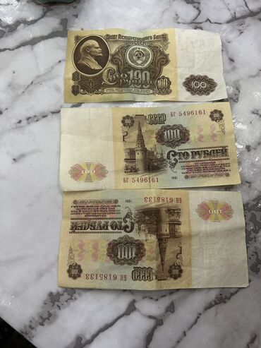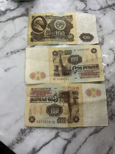 SSR dövrünə aid orijinal kağız pullar kolleksiyası. Dəst tərkibi: - 100 rubl – Sovet İttifaqı Dövlət Bankının banknotu, üz tərəfində SSRİ gerbi və dekorativ ornamentlər, kənarda “100” nominal işar...