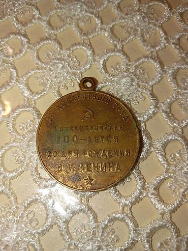 - Arxa üz: rus dilində yazı – “Za doblestnyy trud. K 100-letiyu so dnya rozhdeniya V. I. Lenina”, çəkiclə orağın emblemi və ulduz nişanı.