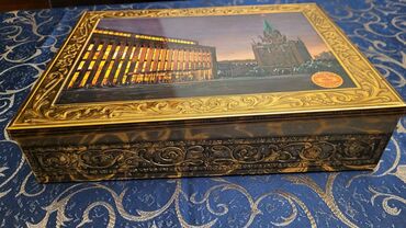 1975-ci ilin ‘Qırmızı Oktyabr’ konfetlərinin boş qutusu. Ölçülər: uzunluğu 31 sm, eni 23 sm, hündürlüyü 7 sm.