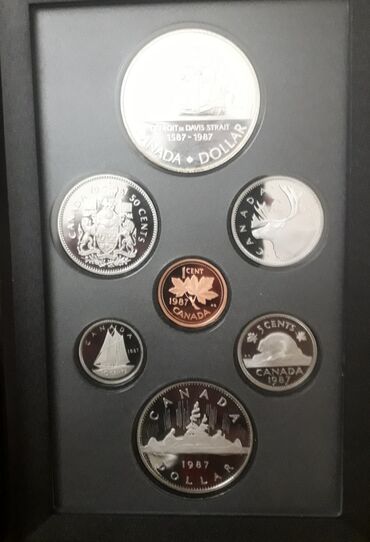Qutuda “Royal Canadian Mint / Monnaie royale canadienne” yazıları və ağcaqayın yarpağı emblemi mövcuddur. Dizaynlar Kanada simvollarını və 1987-ci ilin anma mövzularını əks etdirir.