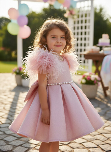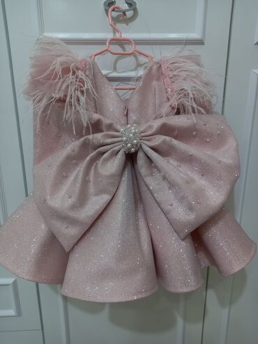 Qız uşağı üçün bayramlıq paltar - Rəng: Açıq çəhrayı - Üst hissə: Parıltılı, qısaqollu bodysueta bənzər korpus - Etek: Geniş, dairəvi kəsim, yumşaq axıcı material - Bəzək: Bütün paltarda 3D çəhray...