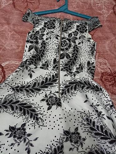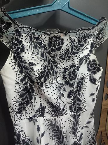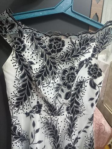 2 ci el geyimlerdir Ağ rəng üzərində qara güllü və yarpaq naxışlı uzun ziyafət donu. Üst hissəsi çiyinlərdən açıq “off-shoulder” kəsimlidir, büzməli haşiyə ilə vurğulanıb. Parça atlas əsas üzərində transparan tül/qipur örtüklə işlənib; naxışlarda parıltılı sap effektləri var. Bel xətti yığılmış, ətəyi geniş və axıcı A-kəsimdədir, tam uzunluqludur. Klassik kontrast rəng palitrası və zərif applikasiya donu toy, nişan, məzuniyyət və digər mərasimlər üçün uyğun edir. Zəncirbənd arxa hissədə yerləşir (şəkillərdə görünən konstruksiya). Minimal aksesuarlarla rahat kombinlənir.