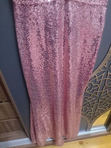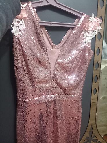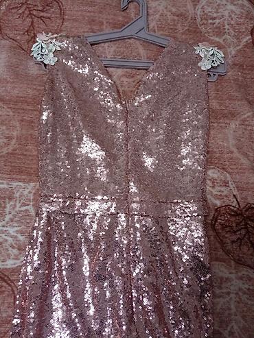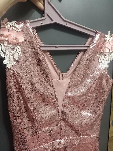 Zərif gecə/libas – pudra-çəhrayı rəngdə - Üst hissə: parıltılı payetlərlə işlənmiş, V-kəsimli büst və qısa qol; ön hissədə qatlama (wrap) tipli kəsim. - Bel xətti: eyni materialdan nazik kəmər, mə...