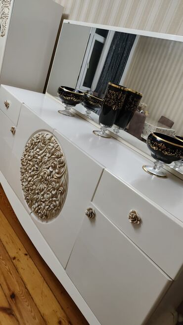 Yemək otağı və qonaq otağı üçün mebel dəsti - Yemək masası və 6 ədəd stul: Təbii ağac rəngində, düzbucaqlı masa. Krem rəngli, yumşaq oturacaqlı və arxalığı olan stullar. Masa geniş ailə və qonaqla...
