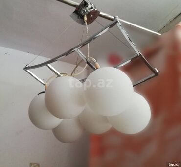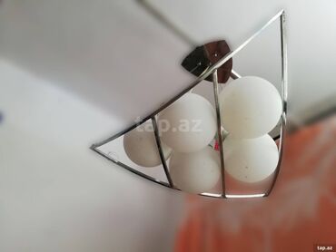 Şüşə-kristal tavan lampası (plasfon) - Forma: dairəvi, yarı-qapalı tavan tipli - Material: parlaq xrom rəngli korpus, kəsimli kristal elementlər və şüşə bəzəklər - Dizayn: ağ fon üzərində qızılı ç...