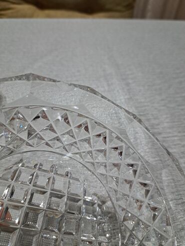 - Şəffaf, ağır kristaldan hazırlanmış, əl işi kəsmələrə bənzər romb nümunəli dekor.