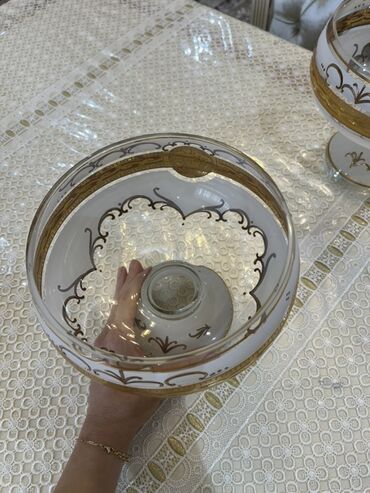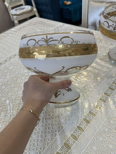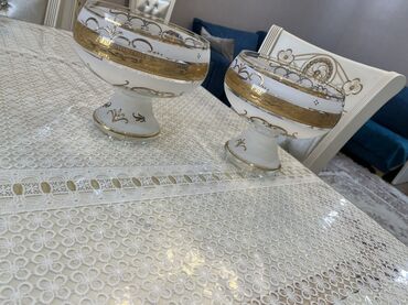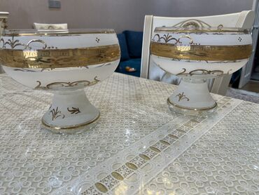 - Dizayn detalları: iki qab tam uyğun ornamentlərlə cüt kimi; ağ-qızılı klassik üslub, zərif naxışlar və yuxarı kənarda dekorativ relyef xəttləri