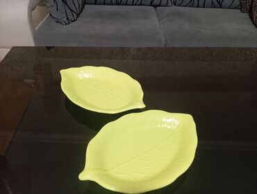 Dəstdə 2 ədəd eyni üslubda yarpaq formalı boşqab var. ünvan Zabrat qəsəbəsi 71nomreli məktəbin yanında 148nomreli marşurutun son dayanacagi