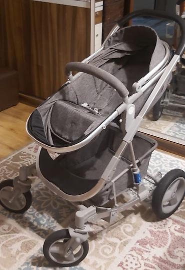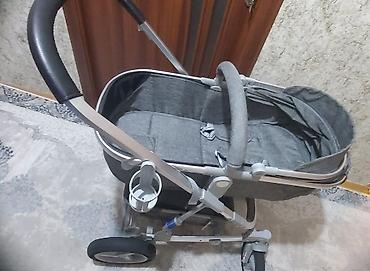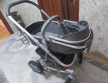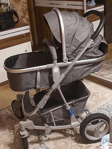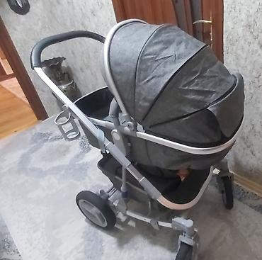 Uşaq arabası – çoxfunksiyalı, bərk konstruksiyalı, boz rəngli 2-in-1 tip.