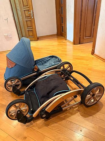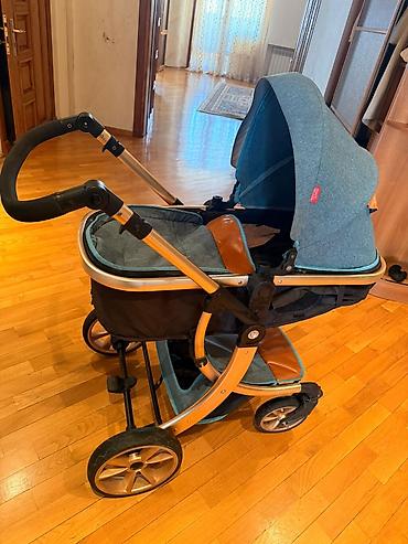 Uşaq arabası dəsti yaxşı vəziyyətdə 1) 0–6 ay üçün beşik tipli arabа - Yumşaq, dərin oturacaq və başlıq - 5 nöqtəli təhlükəsizlik kəməri - Güclü metal şassi - Böyük arxa təkərlər, ön təkərlər fırl...
