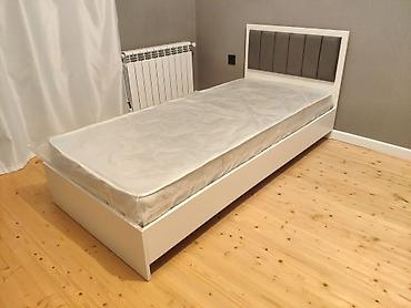 Çarpayı – tək nəfərlik model - Rəng: ağ - Yumşaq başlıq (dəri/eko-dəri görünüşlü) - Karkas: korpus tipli baza, alt hissə qapalı - Döşək (matras) hədiyyə kimi göstərilib - Ölçü təxmini: tək ölçü (uş...