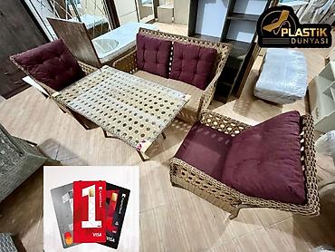 Metall karkaslı salon/terrasa mebel dəsti - Komplekt: 1 ədəd iki nəfərlik divan + 2 ədəd kreslo - Dizayn: Minimalist “loft/industrial” üslub, yan tərəflərdə X-formalı metalkarkas - Rəng: Tünd yaşı...