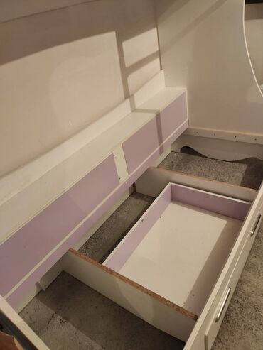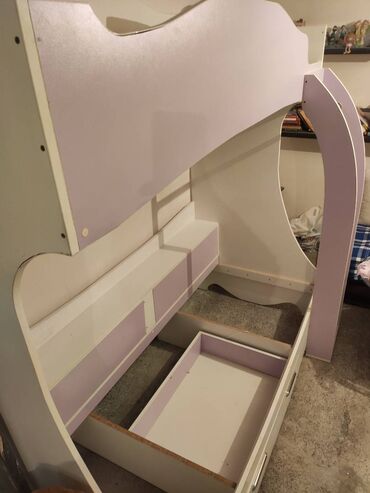 İki mərtəbəli uşaq çarpayısı - Ölçü: 180x80 - Rəng: ağ - Konstruksiya: yan divarlarla təhlükəsizliyə uyğun üst qat, alt qat; yan tərəfdə metal tutacaqlı nərdivan - Aşağı hissədə iki ədəd geniş sür...