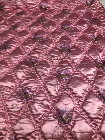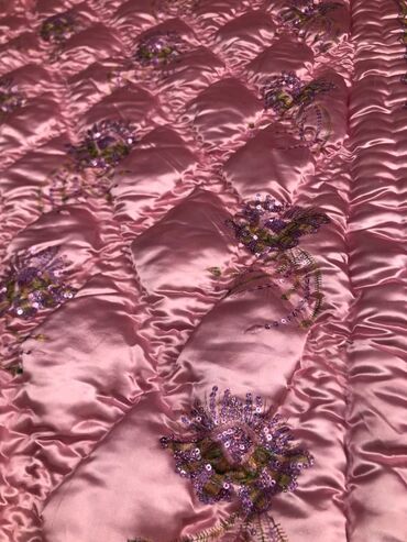 Məhsul: Taxt üçün yorğan örtük/yorğan üzü dəsti - Rəng: Çəhrayı (üst hissəsi parıltılı, naxışlı atlas effektli; iç tərəfi mat, yumşaq parça) - Dizayn: Klassik gül və həndəsi naxışlar, parıltılı ...