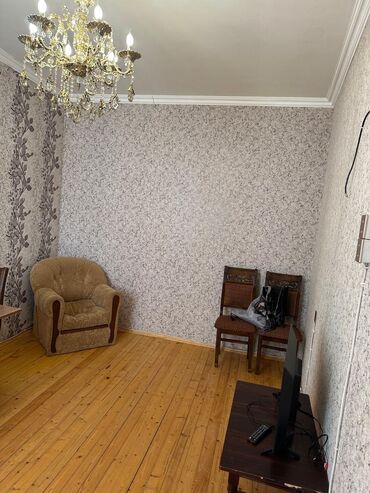 Mənzil zövqlü tapetlərlə, hündür tavan və ağ plintus-karnizlərlə tamamlanıb. Əşyalar: kreslo, stullar, böyük masa, 2 tək çarpayı, güzgülü dolab, TV və masası. İşıqlanma hər iki otaqda dekorativ çılçıraqla təmin olunub. Taxta döşəmələr təmiz və isti atmosfer yaradır.