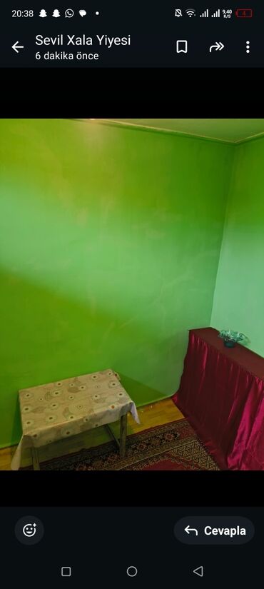- Ayrı kiçik otaq/zal: parlaq yaşıl divarlar, taxta döşəmə üstündə xalça, üzlüklü kiçik masa, bəzək qabları olan örtüklü konsol.